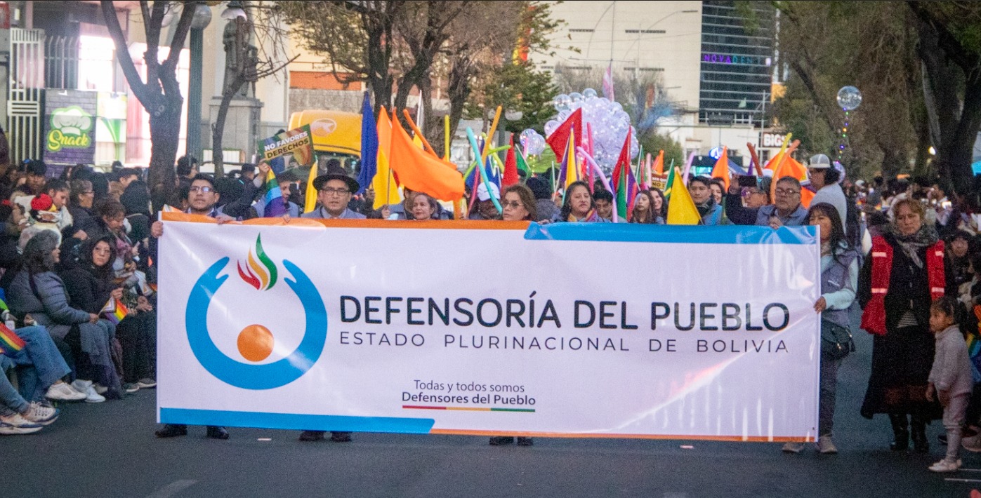 on la participación de representantes de diversos colectivos, el Defensor del Pueblo, Pedro Callisaya, realizó una serie de acciones en conmemoración del ‘Día Internacional del Orgullo LGBTI+’, como el pintado del paso peatonal en la ciudad de La Paz, así como su participación en la Marcha del Orgullo que se realizó este 28 de junio en la ciudad Tarija. “Más allá de ser un acto simbólico, creemos que es un acto de resistencia e interpelación que no se reduce únicamente a este día, sino es una actividad institucional permanente exigiendo la construcción y aplicación de políticas públicas para la emisión de normativa y diferentes acciones al Estado, que nos permita consolidar la construcción de una sociedad en la que pensar diferente o ser diferente no sea motivo de exclusión”, remarcó Callisaya, durante el acto de pintado. En ese marco, este 28 de junio, la Defensoría del Pueblo emitió un Pronunciamiento en el que exhorta al Estado boliviano, tanto en su nivel central como en sus entidades autónomas descentralizadas, a adoptar acciones afirmativas eficaces que garanticen la igualdad de las personas LGBTI+ en todos los ámbitos de la vida, asegurando el ejercicio pleno e integral de sus derechos, en el marco de una cultura democrática basada en el respeto, la inclusión y la no discriminación.