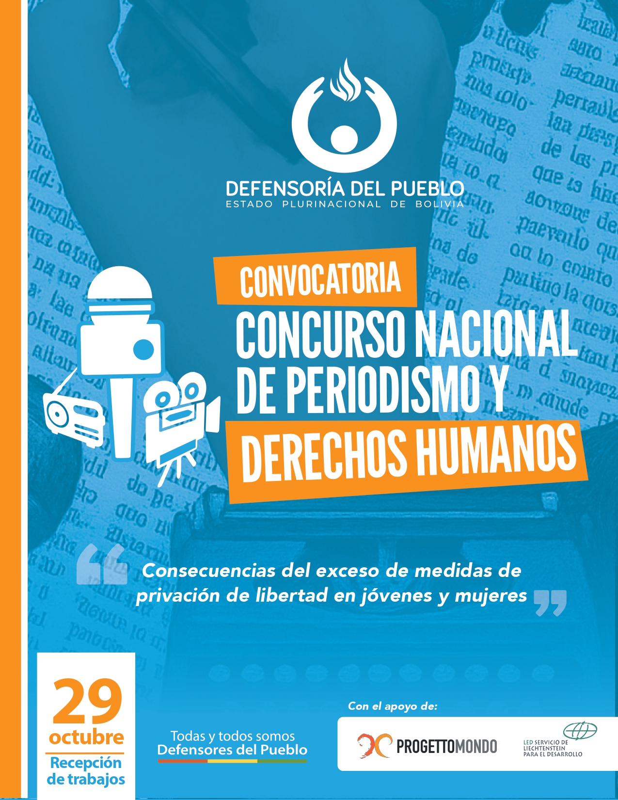 a Defensoría del Pueblo, con el apoyo de Progettomondo, realizó el lanzamiento del concurso nacional de periodismo y derechos humanos “Consecuencias del exceso de medidas de privación de libertad en jóvenes y mujeres”, el cual es parte de las iniciativas destinadas a sensibilizar a la sociedad boliviana frente a situaciones de vulneración de derechos fundamentales en recintos penitenciarios. Este concurso busca incentivar la producción de contenidos periodísticos con enfoque de derechos humanos, género y juventud de los privados de libertad y de la misma forma visibilizar ante la sociedad boliviana los impactos de la detención preventiva y el hacinamiento en centros penitenciarios.