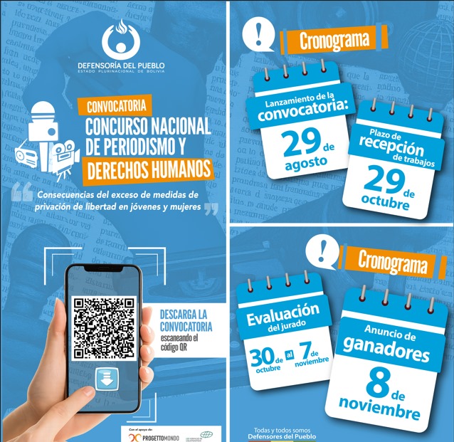 e acuerdo a la convocatoria las categorías de los trabajos a presentar se enmarcan en prensa escrita y medios digitales, radio y televisión. Los participantes, podrán entregar más de un trabajo, siempre que sean en categorías diferentes; los trabajos presentados deberán ser publicados/difundidos entre el 30 de agosto y el 29 de octubre de 2025. Los ganadores de cada categoría recibirán Bs. 600 como premio. Los trabajos periodísticos podrán abordar temáticas referentes a la juventud privada de libertad como acceso a educación, salud y derechos fundamentales; reinserción social, empleo y oportunidades para jóvenes privados de libertad; mujeres privadas de libertad: maternidad, violencia y discriminación; hacinamiento, detención preventiva y políticas penitenciarias y; experiencias y buenas prácticas de reintegración social en Bolivia y la región. El concurso se enmarca en la investigación “Diagnóstico Nacional de Población Juvenil Privada de Libertad (2025)”, la cual analiza las condiciones de vida de mujeres y varones jóvenes entre 18 y 28 años privados de libertad en centros penitenciarios del país, presentada la semana pasada por la Defensoría del Pueblo, a través del Mecanismo Nacional de Prevención de la Tortura en coordinación con Progettomondo.
