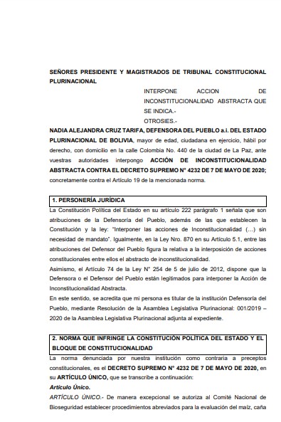 Descripción : Acción de Inconstitucionalidad Abstracta en cuarentena generada por el D.S. 4231 y normas conexas en grave negación a la libre expresión y otros contenidos constitucionales y democráticos.