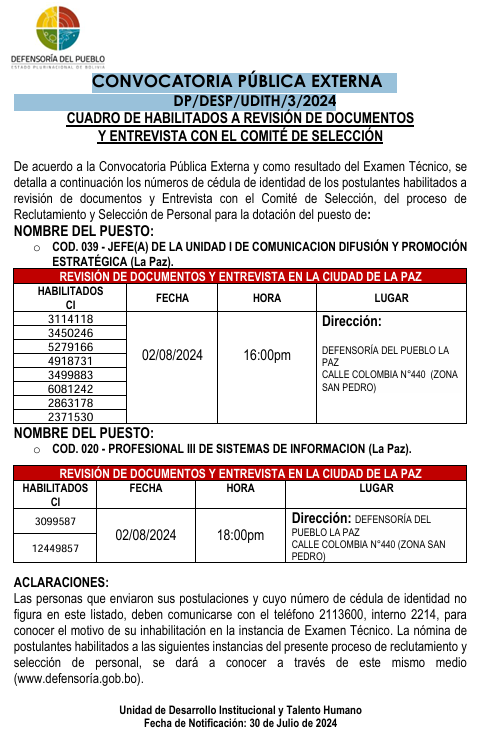 Descripción : CONVOCATORIA PUBLICA EXTERNA N°1-2024, PROFESIONAL EN DERECHOS DE LAS NACIONES Y PUEBLOS INDÍGENA ORIGINARIO CAMPESINOS, PUEBLO AFROBOLIVIANO Y MADRE TIERRA