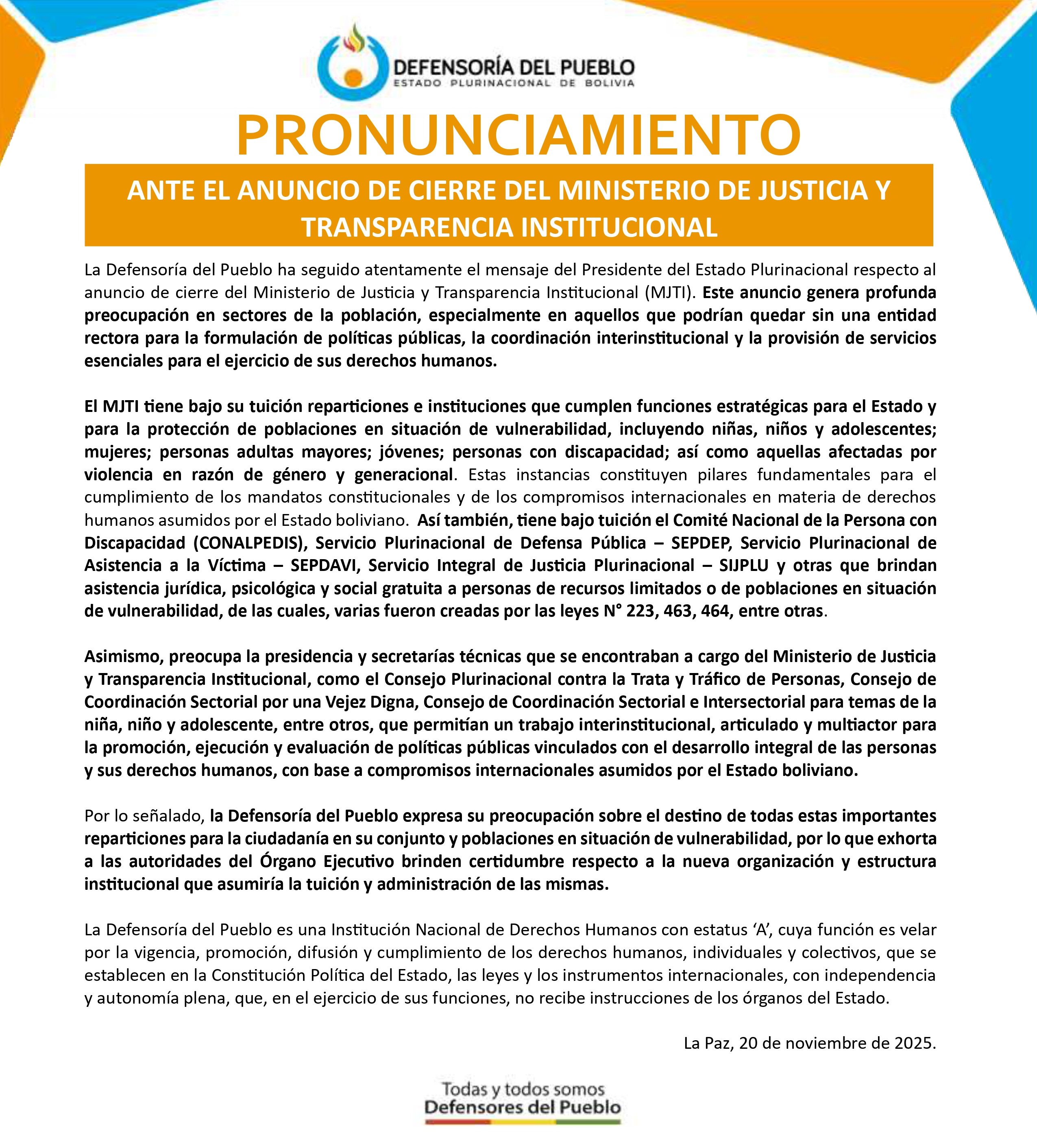 Por lo señalado, la Defensoría del Pueblo expresa su preocupación sobre el destino de todas estas importantes reparticiones para la ciudadanía en su conjunto y poblaciones en situación de vulnerabilidad, por lo que exhorta a las autoridades del Órgano Ejecutivo brinden certidumbre respecto a la nueva organización y estructura institucional que asumiría la tuición y administración de las mismas.