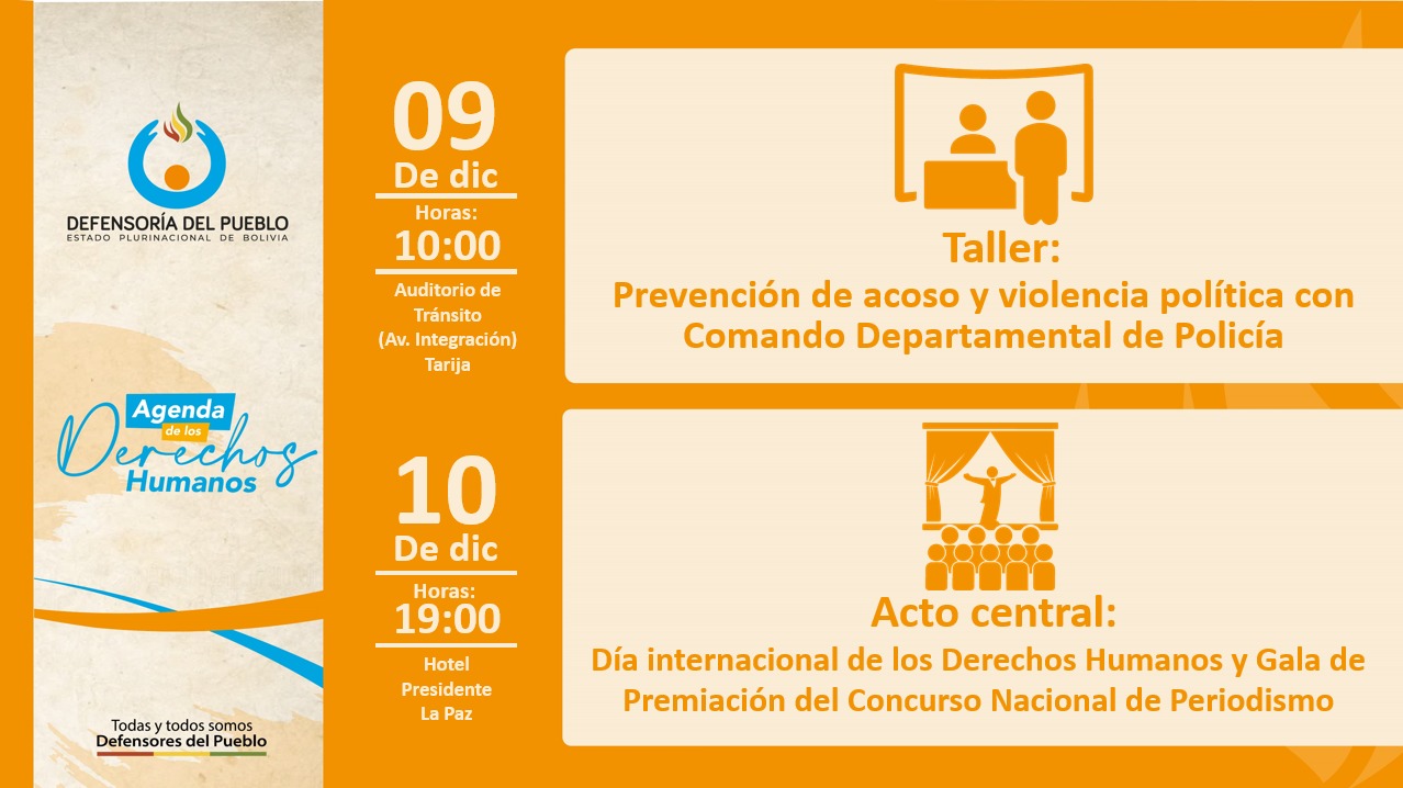 Ese mismo día, Tarija llevará adelante el taller “Prevención de Acoso y Violencia Política”, con el apoyo del Comando Departamental de la Policía. En Sucre se desarrollarán dos actividades: la Feria Interactiva “Promoviendo los Derechos Humanos y la Cultura de Paz desde un Enfoque Restaurativo” y la Feria Interinstitucional “Todos somos Defensores del Pueblo”.