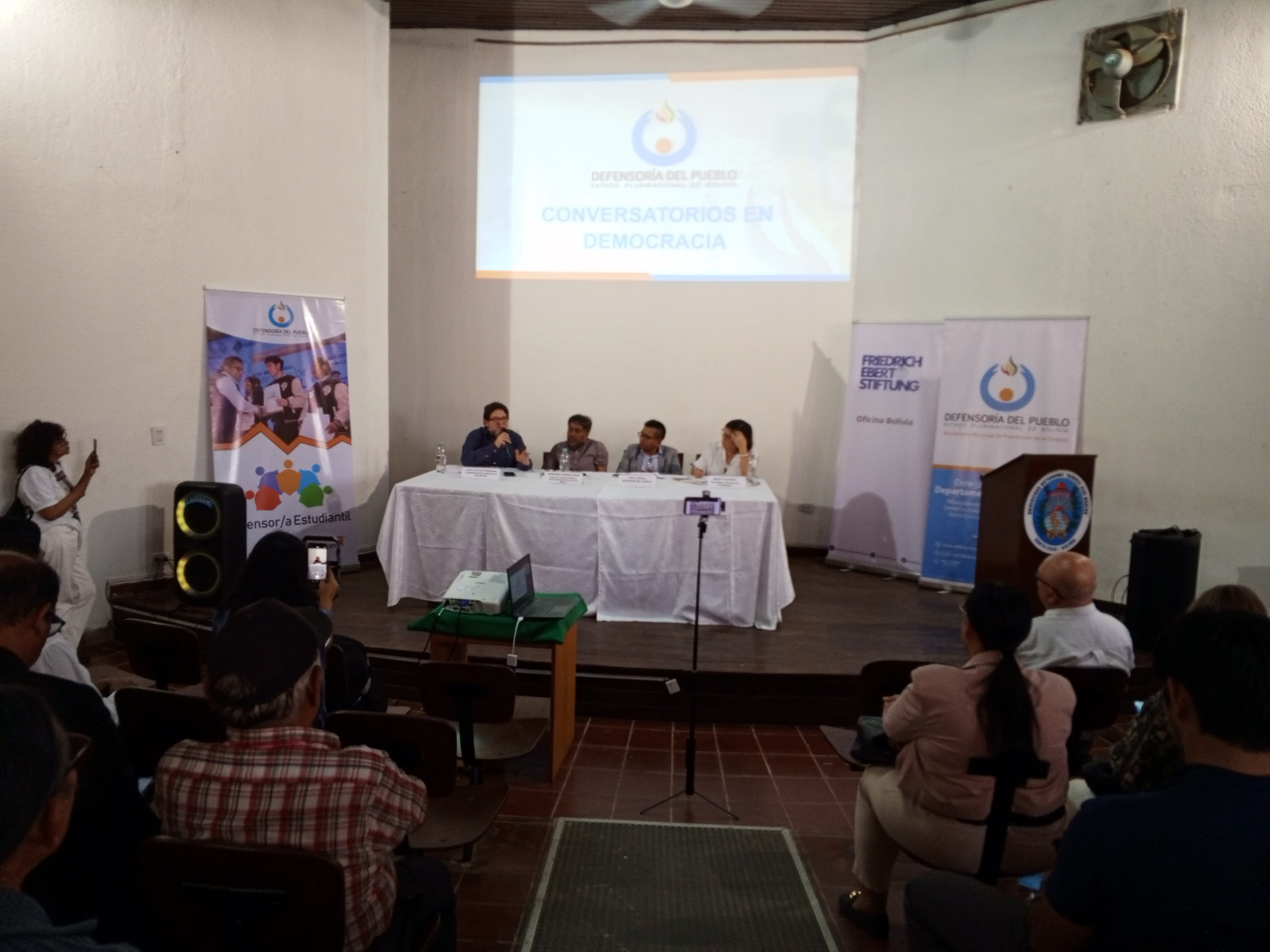 El conversatorio realizado en el Aula Magna de la Universidad Autónoma Gabriel Rene Moreno, contó con la participación del Defensor del Pueblo del Estado Plurinacional de Bolivia, Pedro Callisaya; la periodista, Maggy Talavera; el docente de periodismo, Fernando García Yapur; y el Coordinador del Proyecto Friedrich Ebert Stiftunq - FES, José Luis Exeni.