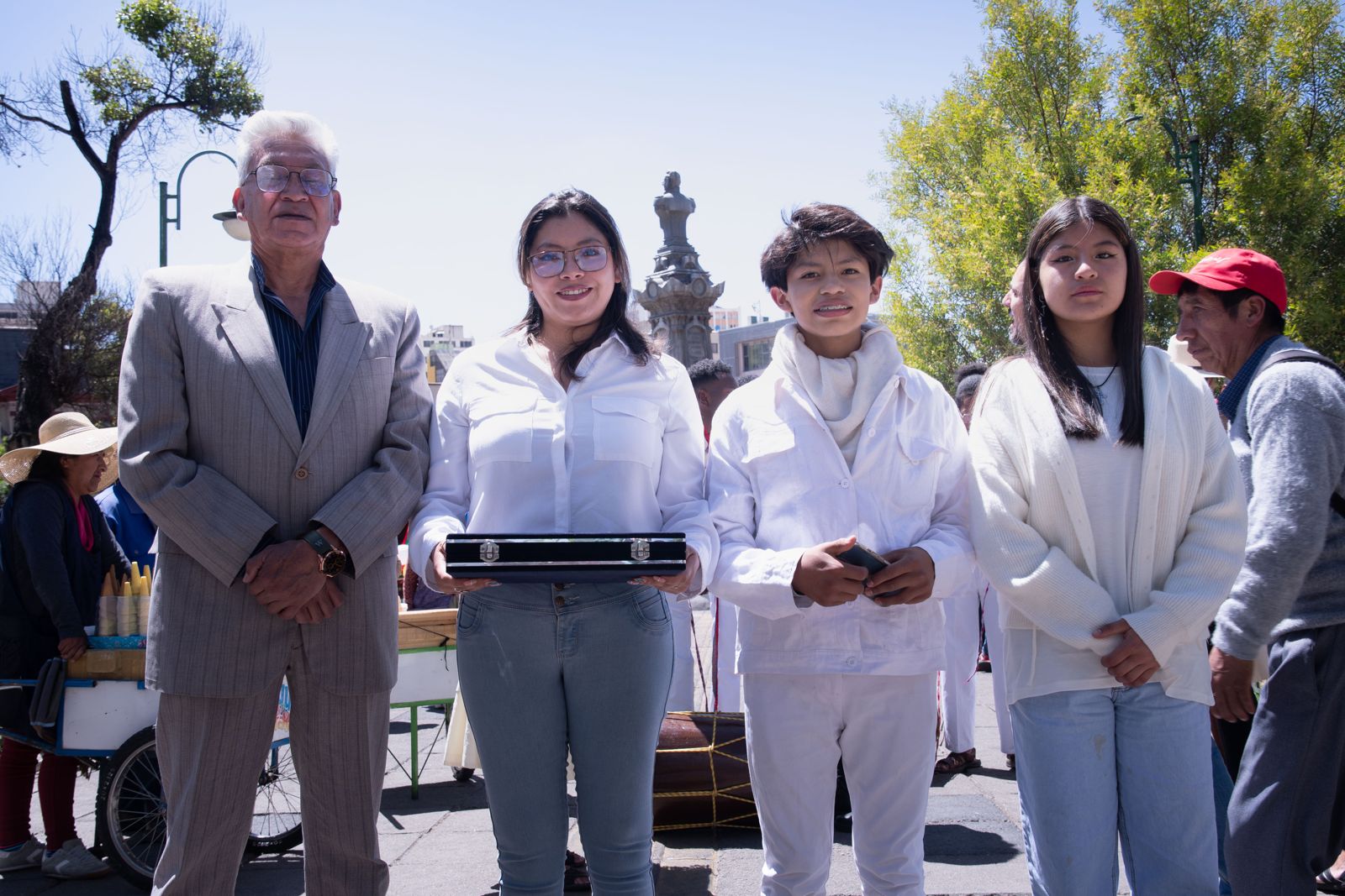 La bandera de la PAZ, fue entregada al Defensor del Pueblo por la Embajadora de los Derechos Humanos y Cultura de Paz, Katherine Ayala, junto a los defensores estudiantiles, José David Averanga y Briana Fernanda Balderrama, el representante de los promotores de derechos humanos de las personas adultas mayores, Rudy Gustavo Larrea Jaude, acompañados por la Coordinadora Residente de la ONU Bolivia.
