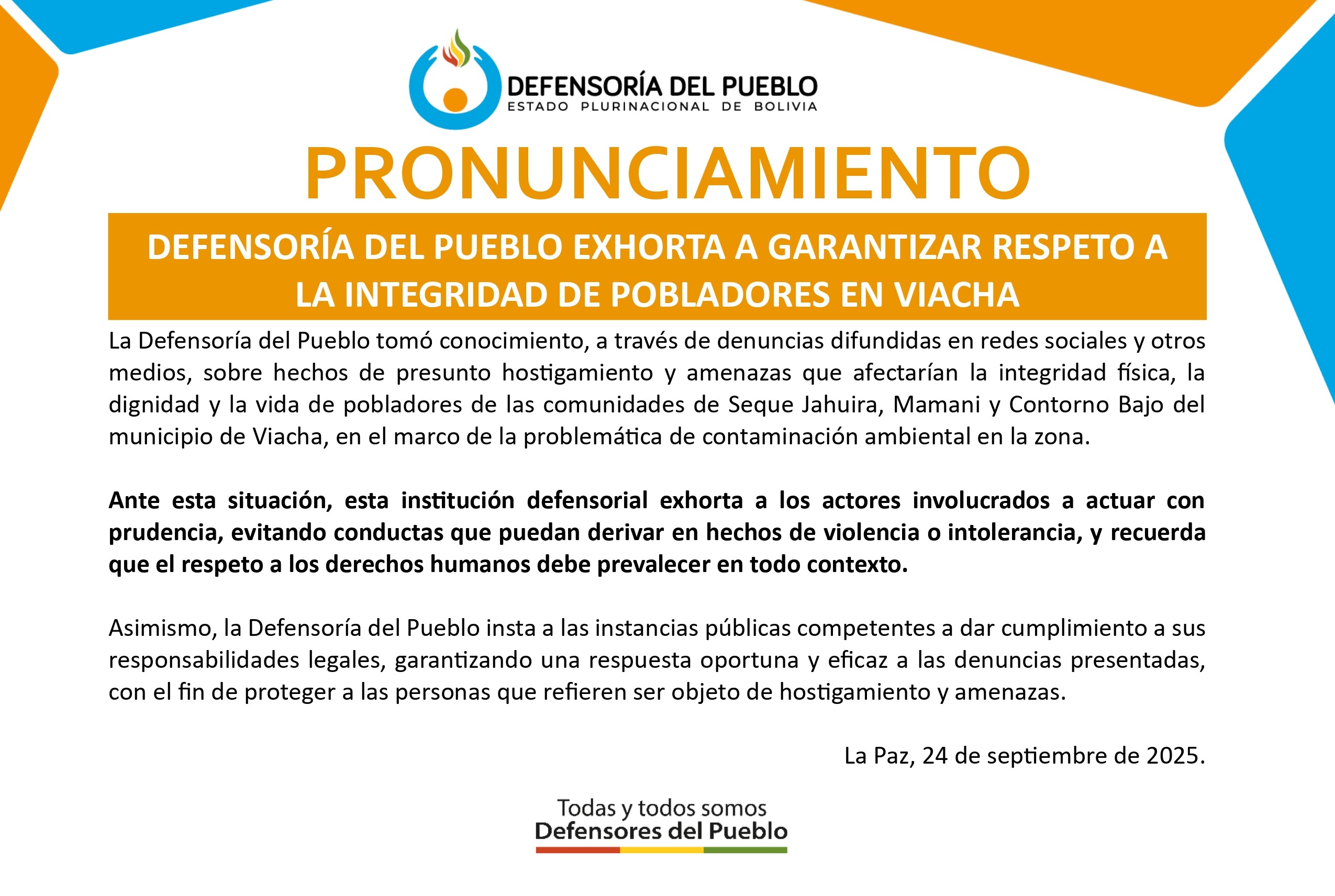 La Defensoría del Pueblo tomó conocimiento, a través de denuncias difundidas en redes sociales y otros medios, sobre hechos de presunto hostigamiento y amenazas que afectarían la integridad física, la dignidad y la vida de pobladores de las comunidades de Seque Jahuira, Mamani y Contorno Bajo del municipio de Viacha, en el marco de la problemática de contaminación ambiental en la zona.