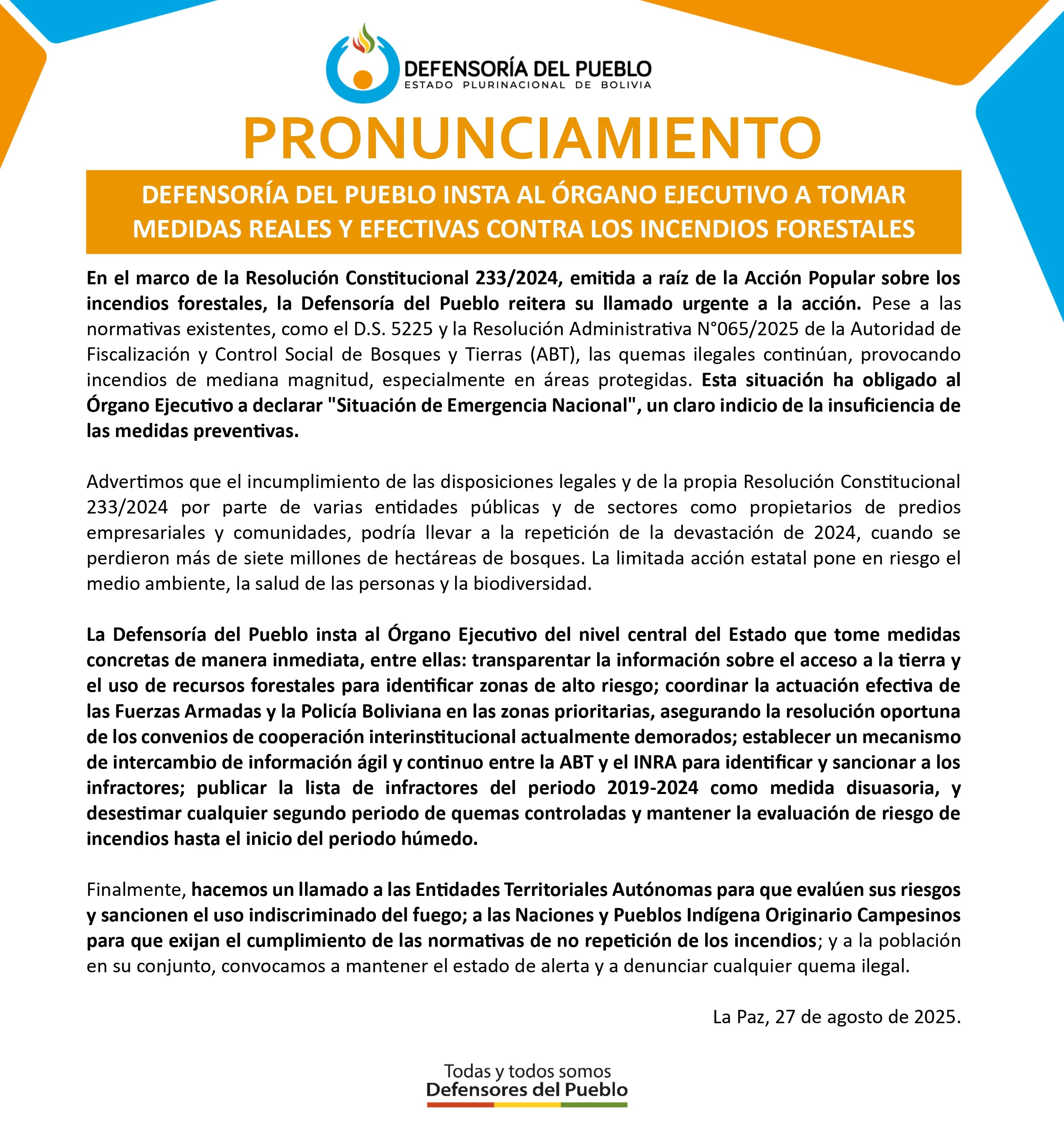 La Defensoría del Pueblo insta al Órgano Ejecutivo del nivel central del Estado que tome medidas concretas de manera inmediata, entre ellas: transparentar la información sobre el acceso a la tierra y el uso de recursos forestales para identificar zonas de alto riesgo; coordinar la actuación efectiva de las Fuerzas Armadas y la Policía Boliviana en las zonas prioritarias, asegurando la resolución oportuna de los convenios de cooperación interinstitucional actualmente demorados; establecer un mecanismo de intercambio de información ágil y continuo entre la ABT y el INRA para identificar y sancionar a los infractores; publicar la lista de infractores del periodo 2019-2024 como medida disuasoria, y desestimar cualquier segundo periodo de quemas controladas y mantener la evaluación de riesgo de incendios hasta el inicio del periodo húmedo.