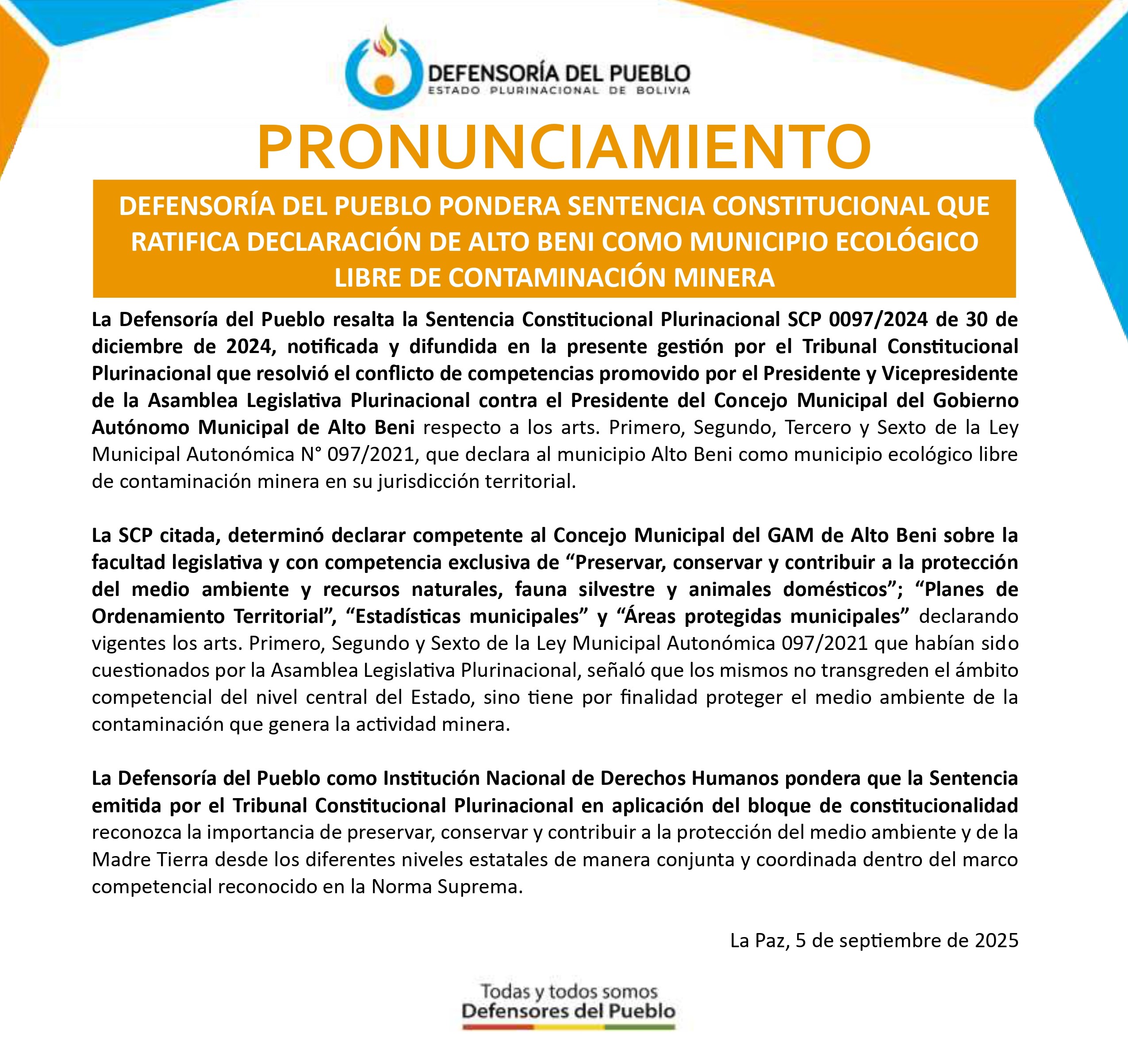 DEFENSORÍA DEL PUEBLO PONDERA SENTENCIA CONSTITUCIONAL QUE RATIFICA DECLARACIÓN DE ALTO BENI COMO MUNICIPIO ECOLÓGICO LIBRE DE CONTAMINACIÓN MINERA