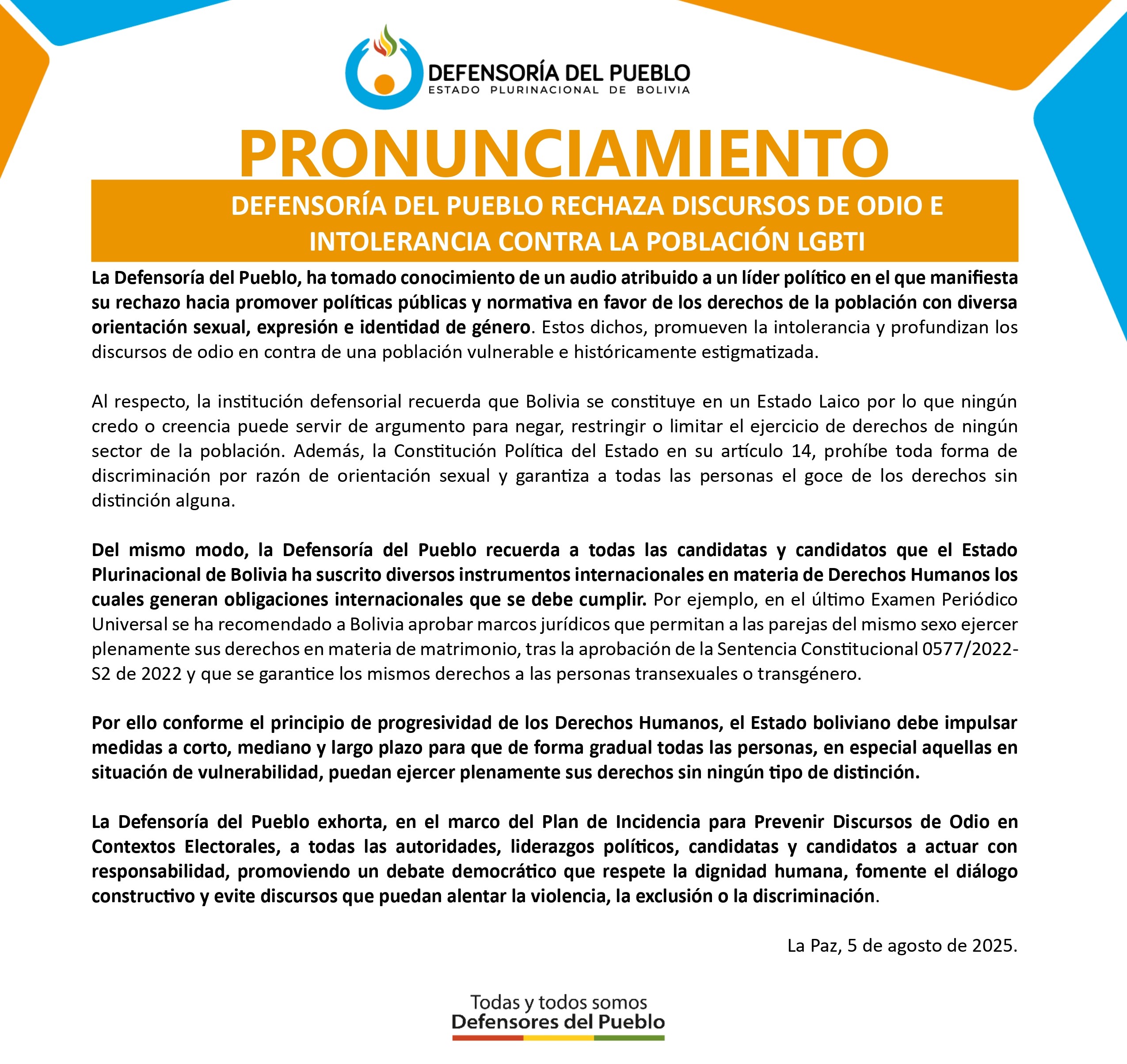 Al respecto, la institución defensorial recuerda que Bolivia se constituye en un Estado Laico por lo que ningún credo o creencia puede servir de argumento para negar, restringir o limitar el ejercicio de derechos de ningún sector de la población. Además, la Constitución Política del Estado en su artículo 14, prohíbe toda forma de discriminación por razón de orientación sexual y garantiza a todas las personas el goce de los derechos sin distinción alguna.
