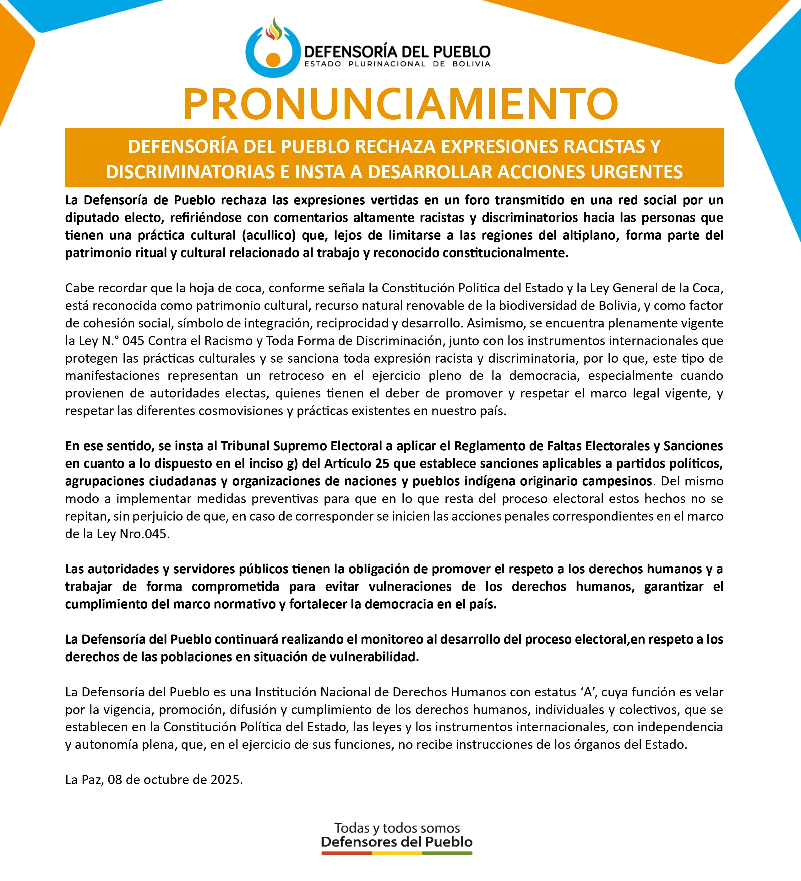 Cabe recordar que la hoja de coca, conforme señala la Constitución Politica del Estado y la Ley General de la Coca, está reconocida como patrimonio cultural, recurso natural renovable de la biodiversidad de Bolivia, y como factor de cohesión social, símbolo de integración, reciprocidad y desarrollo. Asimismo, se encuentra plenamente vigente la Ley N.° 045 Contra el Racismo y Toda Forma de Discriminación, junto con los instrumentos internacionales que protegen las prácticas culturales y se sanciona toda expresión racista y discriminatoria, por lo que, este tipo de manifestaciones representan un retroceso en el ejercicio pleno de la democracia, especialmente cuando provienen de autoridades electas, quienes tienen el deber de promover y respetar el marco legal vigente, y respetar las diferentes cosmovisiones y prácticas existentes en nuestro país.