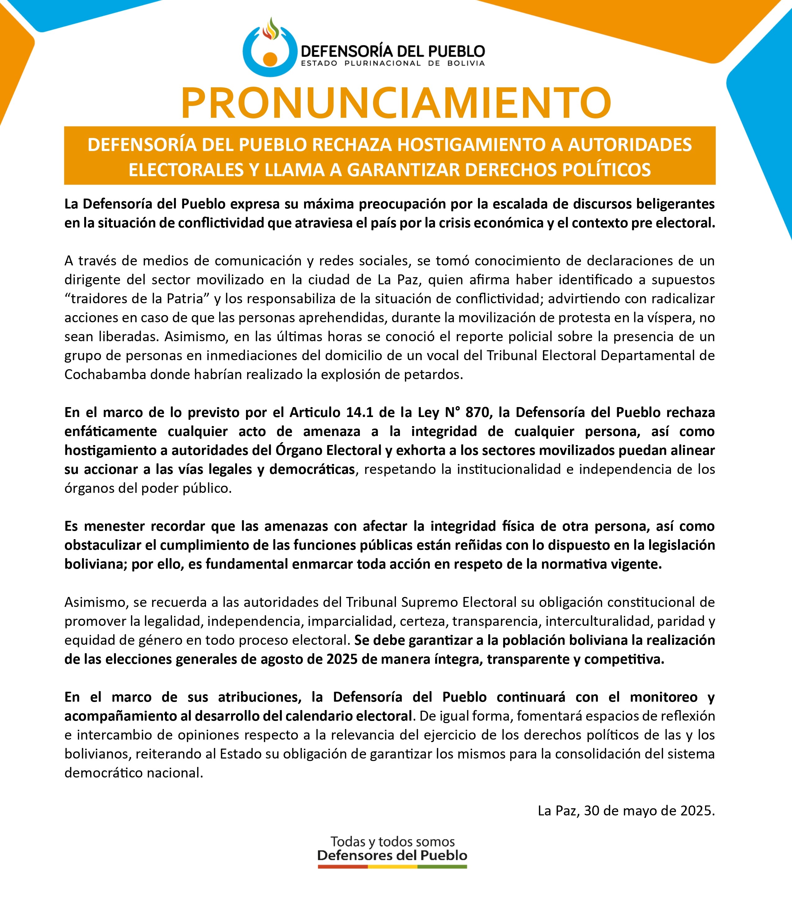 En el marco de lo previsto por el Articulo 14.1 de la Ley N° 870, la Defensoría del Pueblo rechaza enfáticamente cualquier acto de amenaza a la integridad de cualquier persona, así como hostigamiento a autoridades del Órgano Electoral y exhorta a los sectores movilizados puedan alinear su accionar a las vías legales y democráticas, respetando la institucionalidad e independencia de los órganos del poder público.