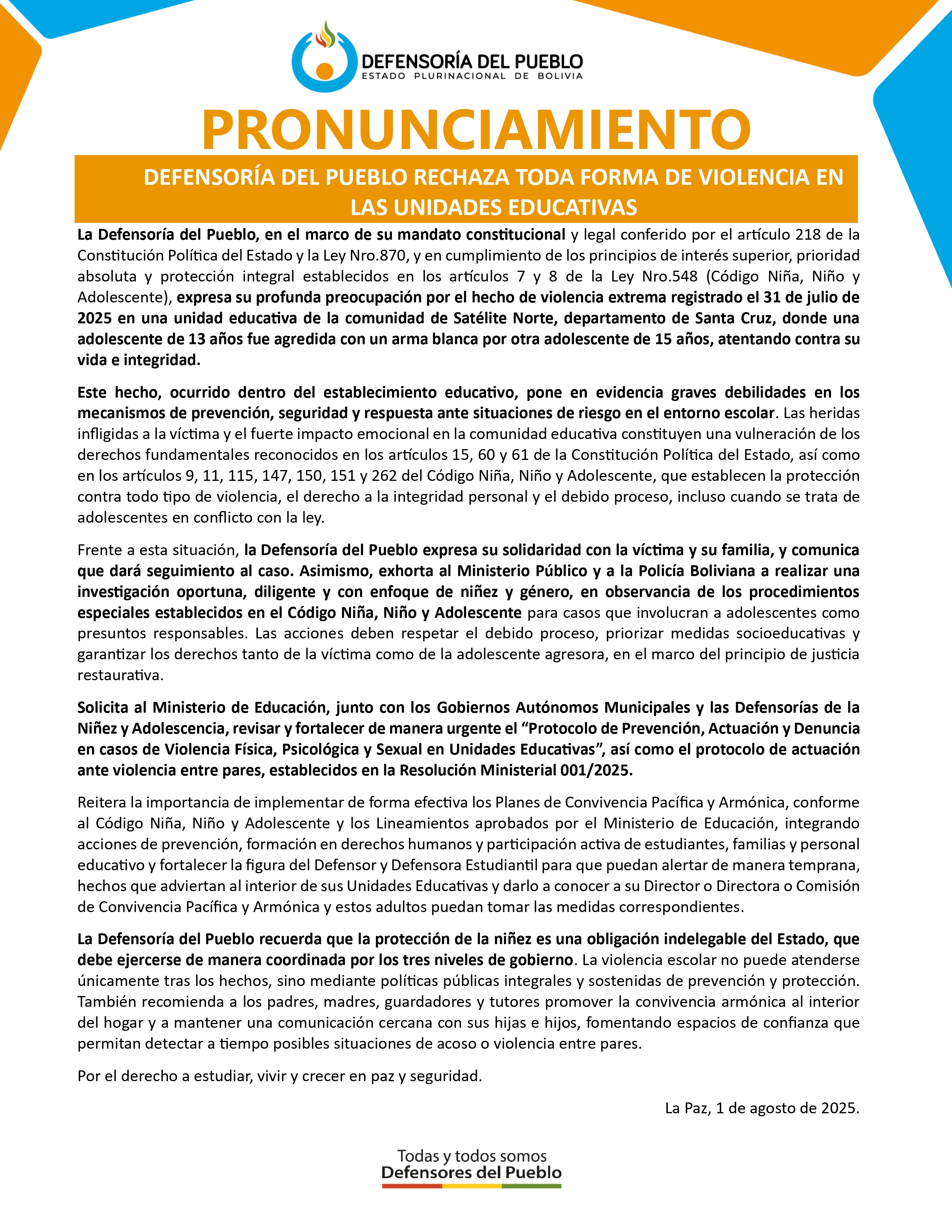 Frente a esta situación, la Defensoría del Pueblo expresa su solidaridad con la víctima y su familia, y comunica que dará seguimiento al caso. Asimismo, exhorta al Ministerio Público y a la Policía Boliviana a realizar una investigación oportuna, diligente y con enfoque de niñez y género, en observancia de los procedimientos especiales establecidos en el Código Niña, Niño y Adolescente para casos que involucran a adolescentes como presuntos responsables. Las acciones deben respetar el debido proceso, priorizar medidas socioeducativas y garantizar los derechos tanto de la víctima como de la adolescente agresora, en el marco del principio de justicia restaurativa.
