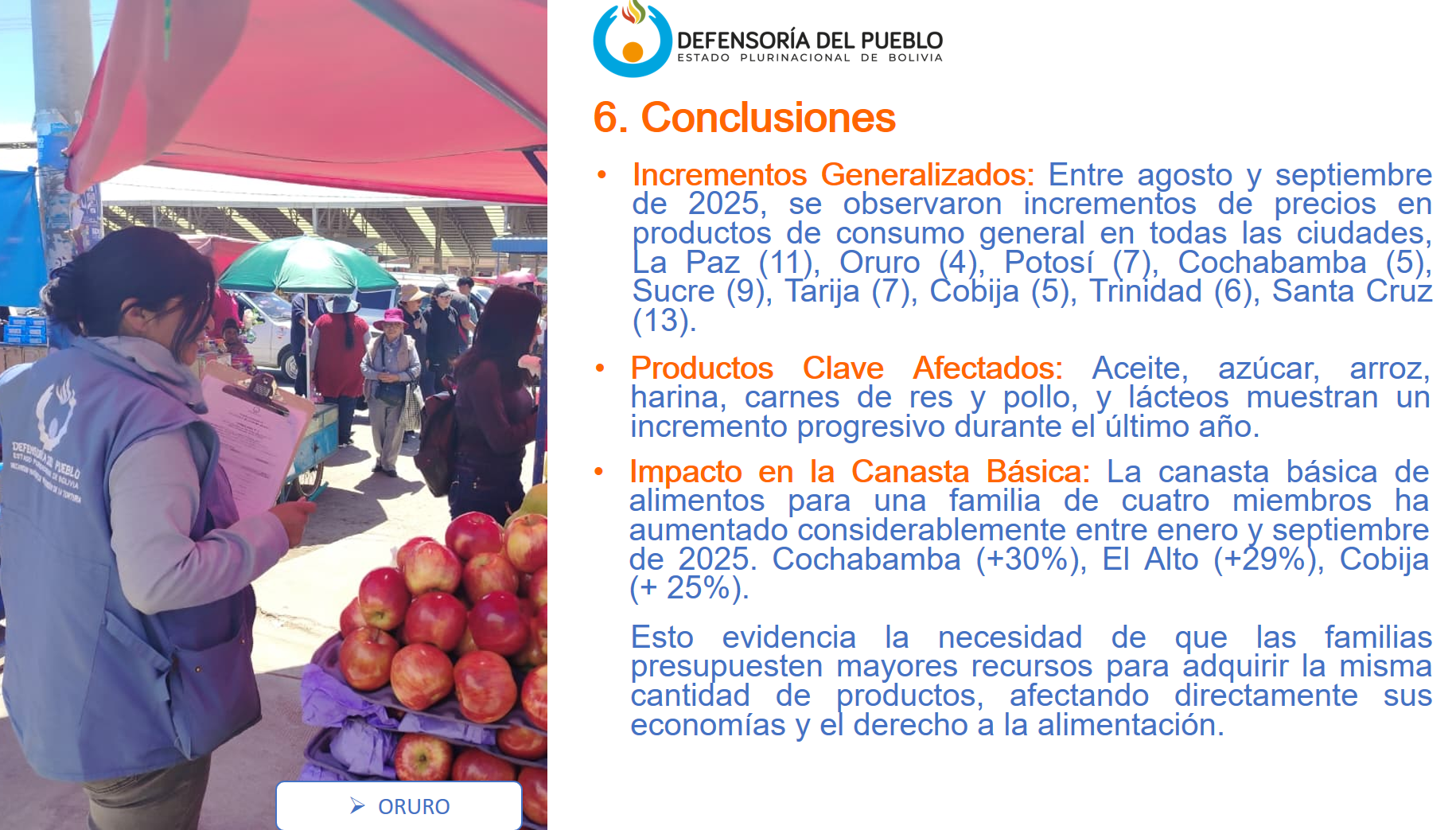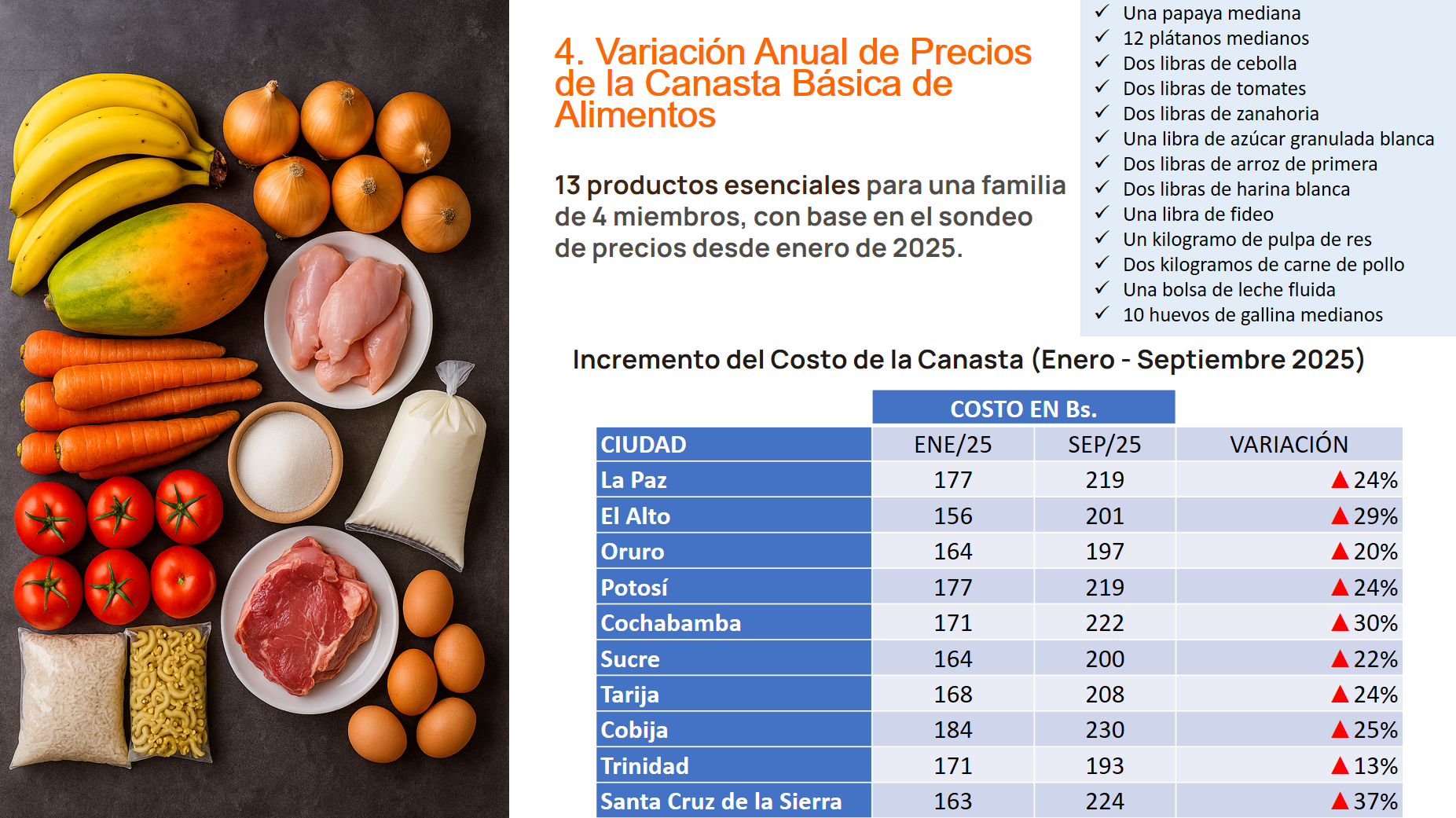 Asimismo, el documento defensorial registra una variación anual en los precios de la canasta básica de alimentos (13 productos) para una familia de cuatro personas, cuyo costo se elevó entre un 13% y un 30% entre enero y septiembre de 2025, según la ciudad.