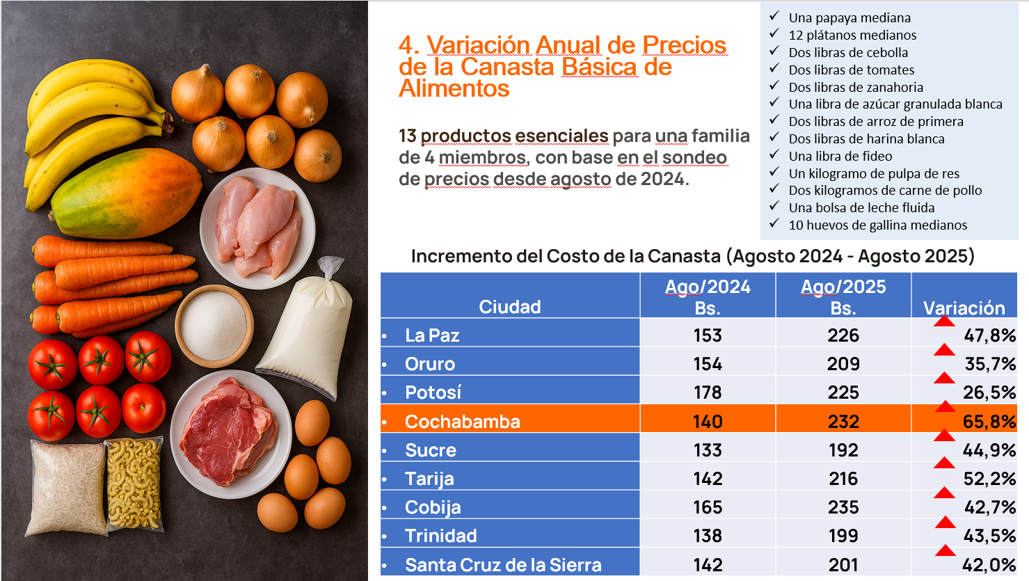 La ciudad de Cochabamba es la que mayor incremento registra en la canasta básica de alimentos, con una variación de Bs. 140 en 2024 a Bs. 232 en agosto de 2025, lo cual representa un incremento del 65.8%.