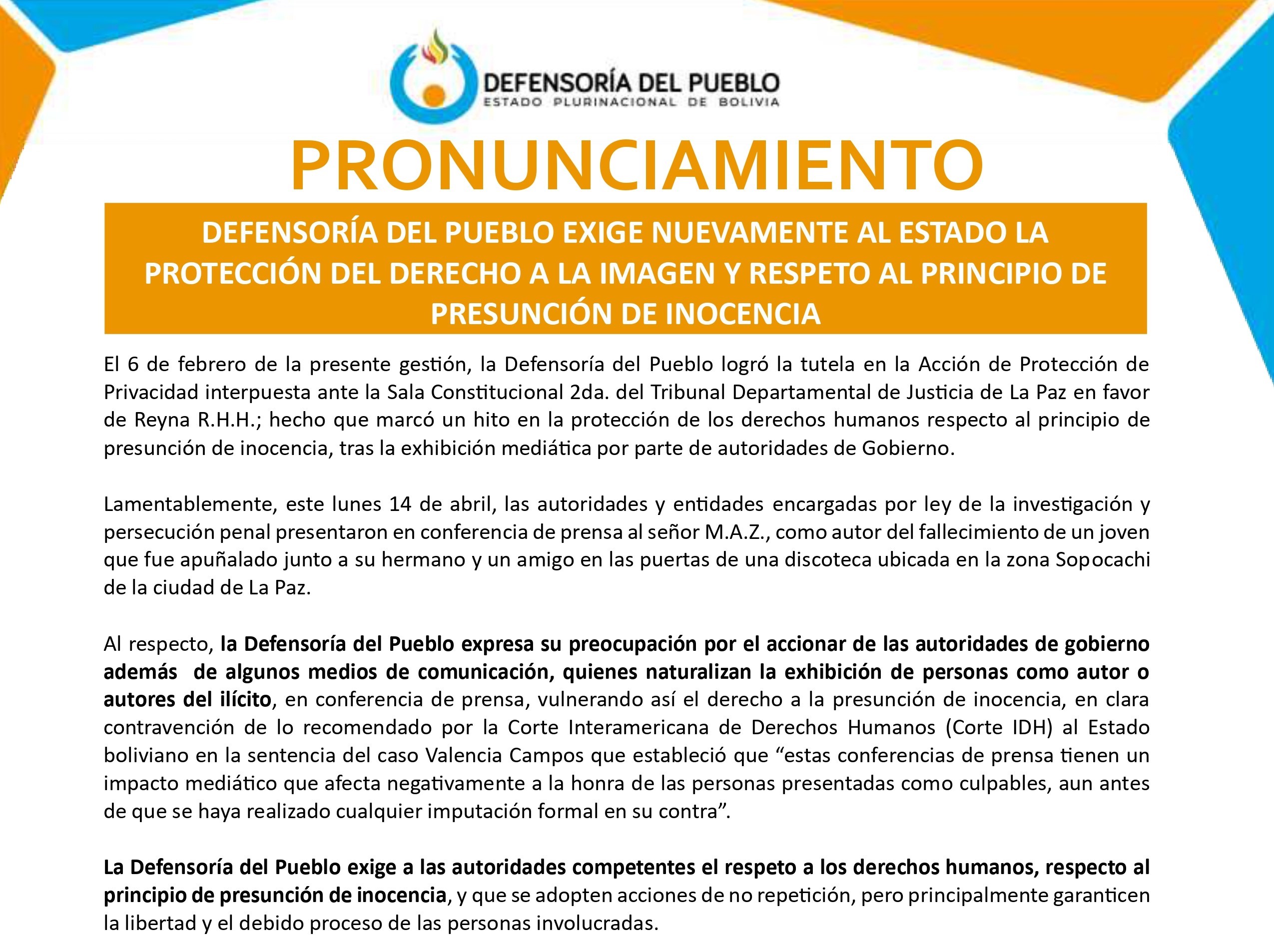 La Defensoría del Pueblo, en cumplimiento de su mandato constitucional de promoción y defensa de los derechos humanos, expresa su profunda preocupación ante las denuncias de hechos de persecución y hostigamiento que, desde 2023, estarían afectando el ejercicio de las funciones públicas de la concejala de Potosí, Reyna Menacho.