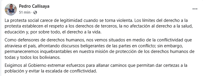 Callisaya, aseguró que “la protesta social carece de legitimidad cuando se