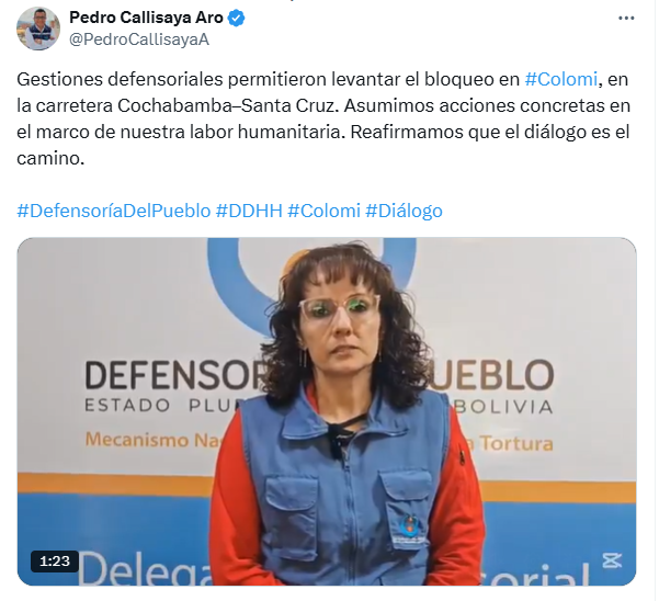 “Gestiones defensoriales permitieron levantar el bloqueo en #Colomi, en la carretera Cochabamba–Santa Cruz. Asumimos acciones concretas en el marco de nuestra labor humanitaria. Reafirmamos que el diálogo es el camino”, destacó el Defensor del Pueblo, Pedro Callisaya en su cuenta de X(Twitter), tras lograrse el paso de los camiones.