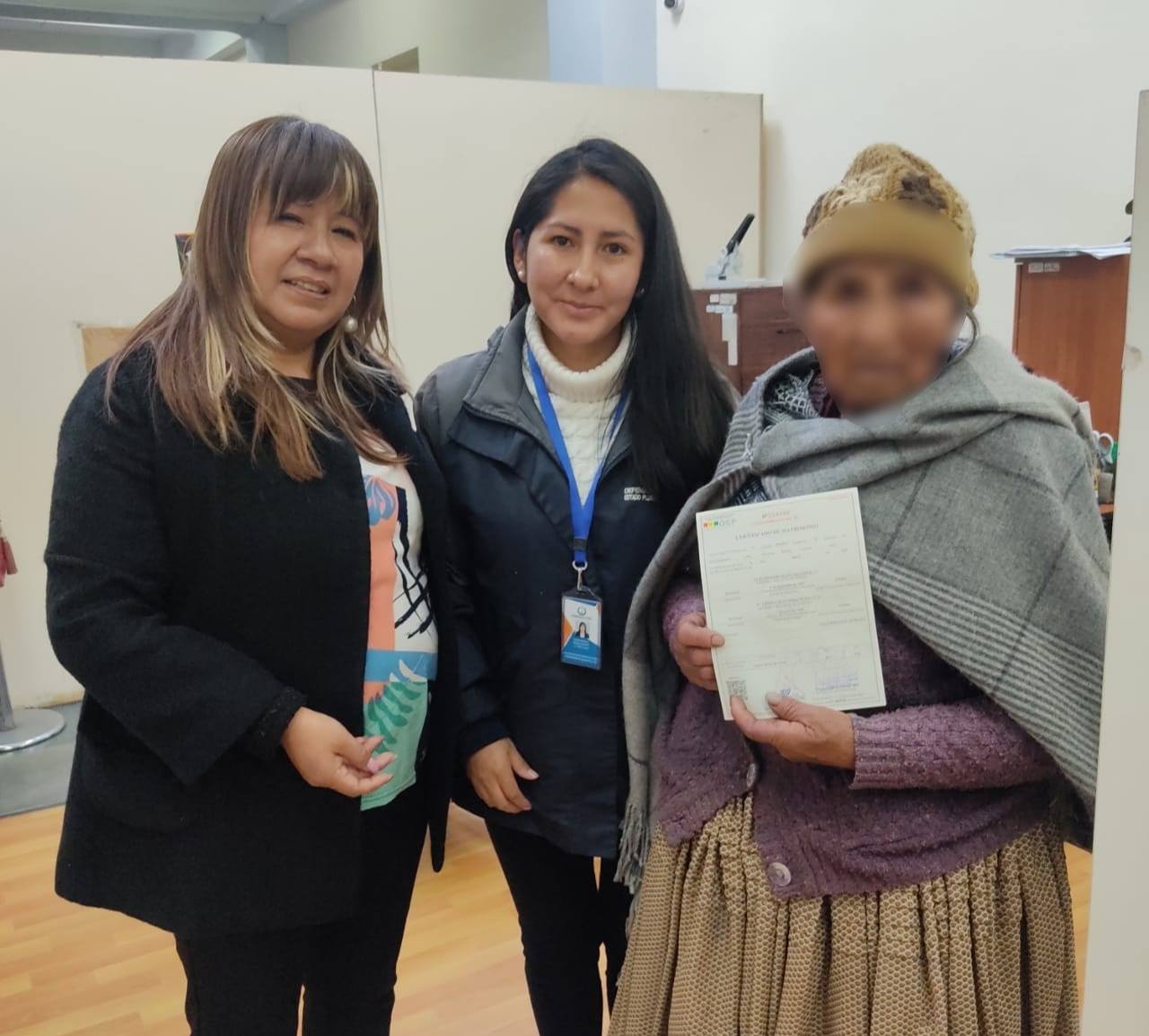 “Por instrucción del Defensor del Pueblo, Pedro Callisaya Aro, realizamos las gestiones para que la adulta mayor, restituya su derecho a la identidad (…) la ciudadana vio sus derechos vulnerados por cerca de tres años, al haber extraviado su documento de identidad y no poder renovarlo, debido a observaciones en sus datos en el Servicio de Registro Cívico por contar con doble partida de matrimonio”, informó la profesional de Servicio al Pueblo de El Alto, Karina Choque.