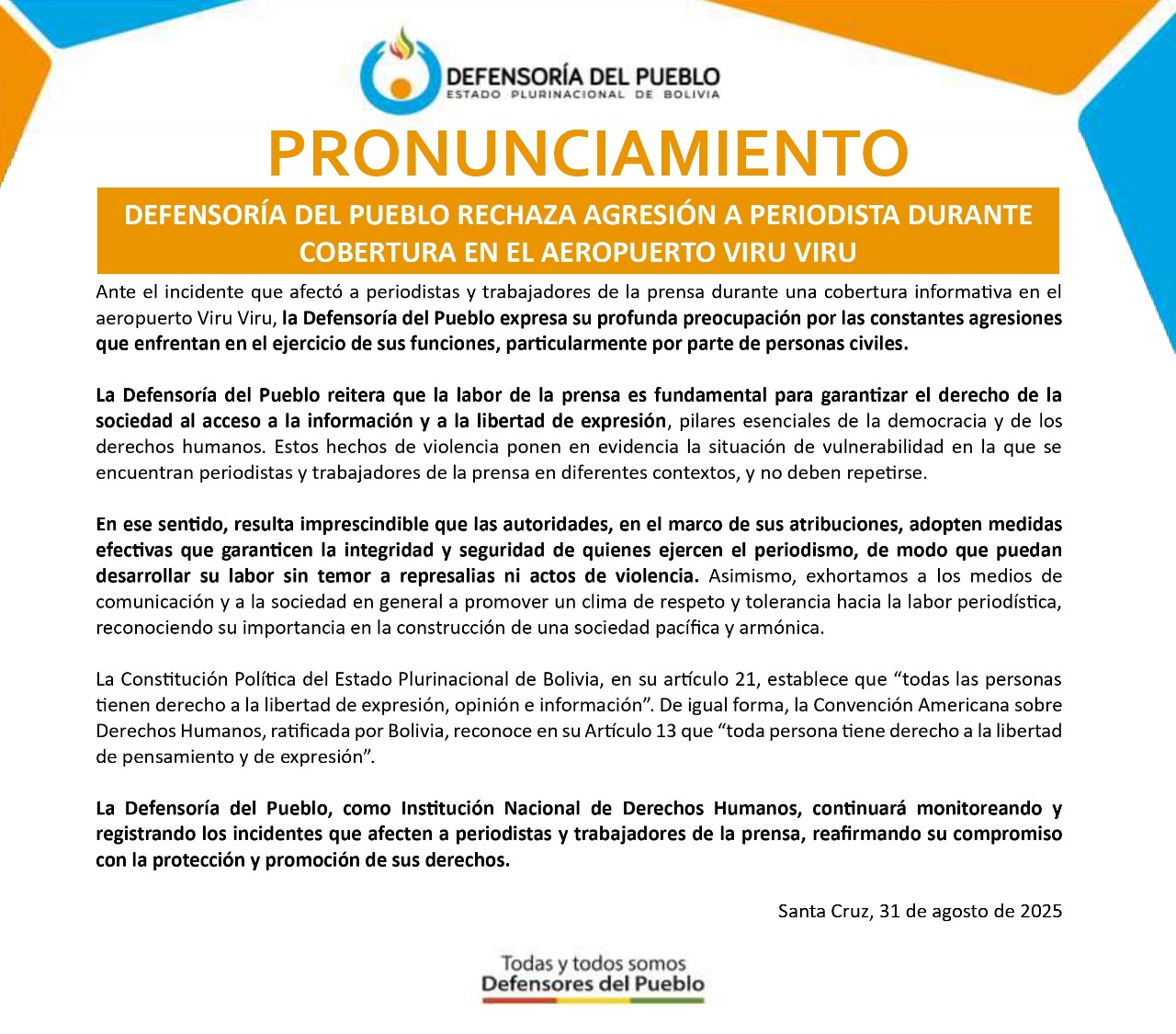 Ante el incidente que afectó a periodistas y trabajadores de la prensa durante una cobertura informativa en el aeropuerto Viru Viru, la Defensoría del Pueblo expresa su profunda preocupación por las constantes agresiones que enfrentan en el ejercicio de sus funciones, particularmente por parte de personas civiles.