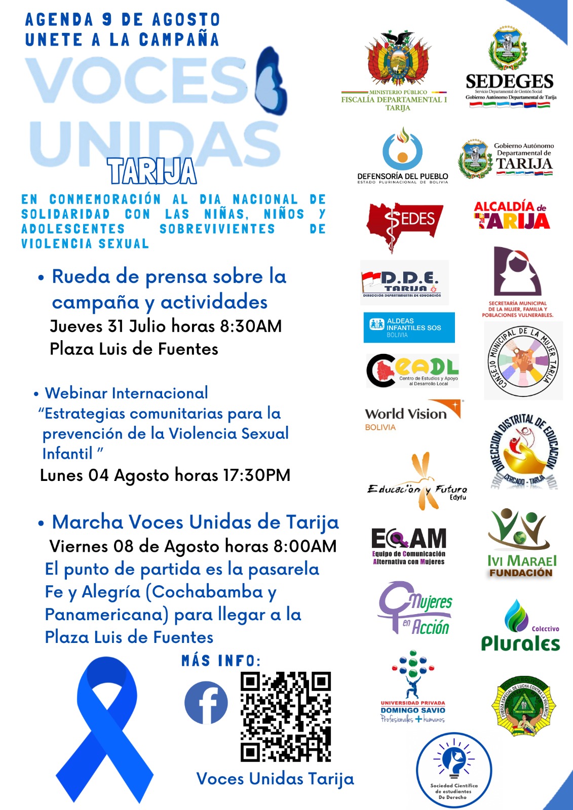 La agenda conmemorativa contempla tres actividades centrales organizadas de manera conjunta con más de 20 instituciones que conforman la mesa interinstitucional. Este lunes 4 de agosto se realizará el webinar internacional "Estrategias comunitarias para prevenir la violencia sexual infantil" con la participación de expertas de Colombia, Honduras y Bolivia. El viernes 8 de agosto está programada la marcha "Voces Unidas Tarija", que partirá desde la pasarela del colegio Fe y Alegría hasta la plaza Luis de Fuentes. Como actividad complementaria, se desarrollará un curso especializado para operadores de justicia sobre interpretación de informes psicológicos en casos de violencia sexual.